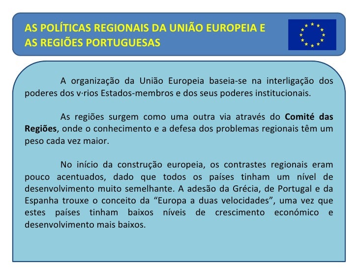 12. 12. A organização da União Europeia baseia-se na interligação dos poderes dos vários Estados-membros e dos seus poderes institucionais. As regiões surgem como uma outra via através do Comité das Regiões , onde o conhecimento e a defesa dos problemas regionais têm um peso cada vez maior. No início da construção europeia, os contrastes regionais eram pouco acentuados, dado que todos os países tinham um nível de desenvolvimento muito semelhante. A adesão da Grécia, de Portugal e da Espanha trouxe o conceito da “Europa a duas velocidades”, uma vez que estes países tinham baixos níveis de crescimento económico e desenvolvimento mais baixos. AS POLÍTICAS REGIONAIS DA UNIÃO EUROPEIA E AS REGIÕES PORTUGUESAS