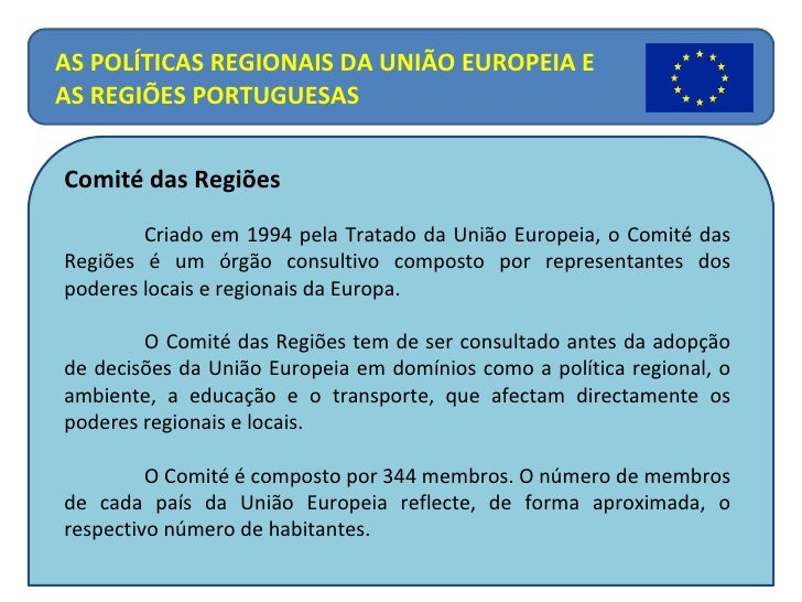 13. 13. Comité das Regiões Criado em 1994 pela Tratado da União Europeia, o Comité das Regiões é um órgão consultivo composto por representantes dos poderes locais e regionais da Europa. O Comité das Regiões tem de ser consultado antes da adopção de decisões da União Europeia em domínios como a política regional, o ambiente, a educação e o transporte, que afectam directamente os poderes regionais e locais. O Comité é composto por 344 membros. O número de membros de cada país da União Europeia reflecte, de forma aproximada, o respectivo número de habitantes. AS POLÍTICAS REGIONAIS DA UNIÃO EUROPEIA E AS REGIÕES PORTUGUESAS