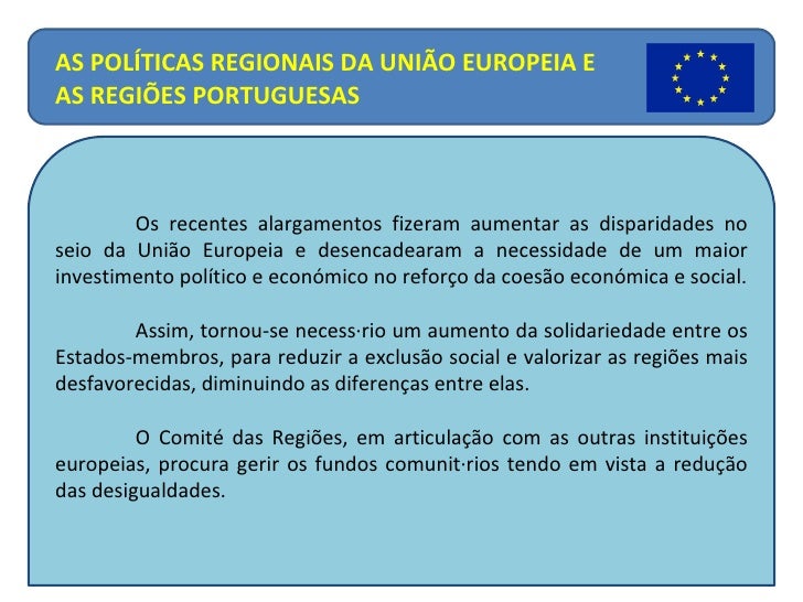 14. 14. Os recentes alargamentos fizeram aumentar as disparidades no seio da União Europeia e desencadearam a necessidade de um maior investimento político e económico no reforço da coesão económica e social. Assim, tornou-se necessário um aumento da solidariedade entre os Estados-membros, para reduzir a exclusão social e valorizar as regiões mais desfavorecidas, diminuindo as diferenças entre elas. O Comité das Regiões, em articulação com as outras instituições europeias, procura gerir os fundos comunitários tendo em vista a redução das desigualdades. AS POLÍTICAS REGIONAIS DA UNIÃO EUROPEIA E AS REGIÕES PORTUGUESAS