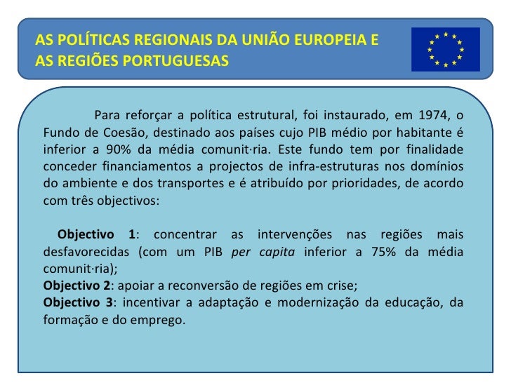 15. 15. Para reforçar a política estrutural, foi instaurado, em 1974, o Fundo de Coesão, destinado aos países cujo PIB médio por habitante é inferior a 90% da média comunitária. Este fundo tem por finalidade conceder financiamentos a projectos de infra-estruturas nos domínios do ambiente e dos transportes e é atribuído por prioridades, de acordo com três objectivos: Objectivo 1 : concentrar as intervenções nas regiões mais desfavorecidas (com um PIB per capita inferior a 75% da média comunitária); Objectivo 2 : apoiar a reconversão de regiões em crise; Objectivo 3 : incentivar a adaptação e modernização da educação, da formação e do emprego. AS POLÍTICAS REGIONAIS DA UNIÃO EUROPEIA E AS REGIÕES PORTUGUESAS