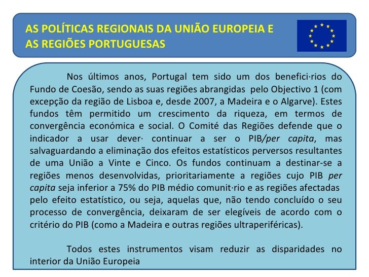 16. 16. Nos últimos anos, Portugal tem sido um dos beneficiários do Fundo de Coesão, sendo as suas regiões abrangidas pelo Objectivo 1 (com excepção da região de Lisboa e, desde 2007, a Madeira e o Algarve). Estes fundos têm permitido um crescimento da riqueza, em termos de convergência económica e social. O Comité das Regiões defende que o indicador a usar deverá continuar a ser o PIB /per capita , mas salvaguardando a eliminação dos efeitos estatísticos perversos resultantes de uma União a Vinte e Cinco. Os fundos continuam a destinar-se a regiões menos desenvolvidas, prioritariamente a regiões cujo PIB per capita seja inferior a 75% do PIB médio comunitário e as regiões afectadas pelo efeito estatístico, ou seja, aquelas que, não tendo concluído o seu processo de convergência, deixaram de ser elegíveis de acordo com o critério do PIB (como a Madeira e outras regiões ultraperiféricas). Todos estes instrumentos visam reduzir as disparidades no interior da União Europeia AS POLÍTICAS REGIONAIS DA UNIÃO EUROPEIA E AS REGIÕES PORTUGUESAS