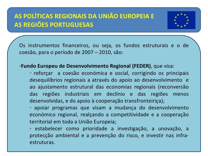 17. 17. <ul><li>Os instrumentos financeiros, ou seja, os fundos estruturais e o de coesão, para o período de 2007 – 2010, são: </li></ul><ul><li>Fundo Europeu de Desenvolvimento Regional (FEDER) , que visa: </li></ul><ul><ul><li>reforçar a coesão económica e social, corrigindo os principais desequilíbrios regionais a através do apoio ao desenvolvimento e ao ajustamento estrutural das economias regionais (reconversão das regiões industriais em declínio e das regiões menos desenvolvidas, e do apoio à cooperação transfronteiriça); </li></ul></ul><ul><ul><li>apoiar programas que visam a mudança do desenvolvimento económico regional, realçando a competitividade e a cooperação territorial em toda a União Europeia; </li></ul></ul><ul><ul><li>estabelecer como prioridade a investigação, a unovação, a protecção ambiental e a prevenção do risco, e investir nas infra-estruturas. </li></ul></ul>AS POLÍTICAS REGIONAIS DA UNIÃO EUROPEIA E AS REGIÕES PORTUGUESAS