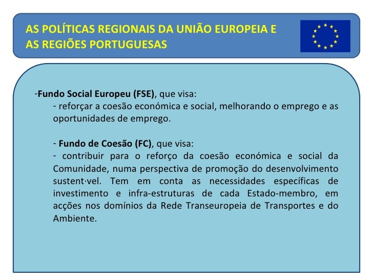 18. 18. <ul><li>Fundo Social Europeu (FSE) , que visa: </li></ul><ul><ul><li>reforçar a coesão económica e social, melhorando o emprego e as oportunidades de emprego. </li></ul></ul><ul><ul><li>Fundo de Coesão (FC) , que visa: </li></ul></ul><ul><ul><ul><li>contribuir para o reforço da coesão económica e social da Comunidade, numa perspectiva de promoção do desenvolvimento sustentável. Tem em conta as necessidades específicas de investimento e infra-estruturas de cada Estado-membro, em acções nos domínios da Rede Transeuropeia de Transportes e do Ambiente. </li></ul></ul></ul>AS POLÍTICAS REGIONAIS DA UNIÃO EUROPEIA E AS REGIÕES PORTUGUESAS