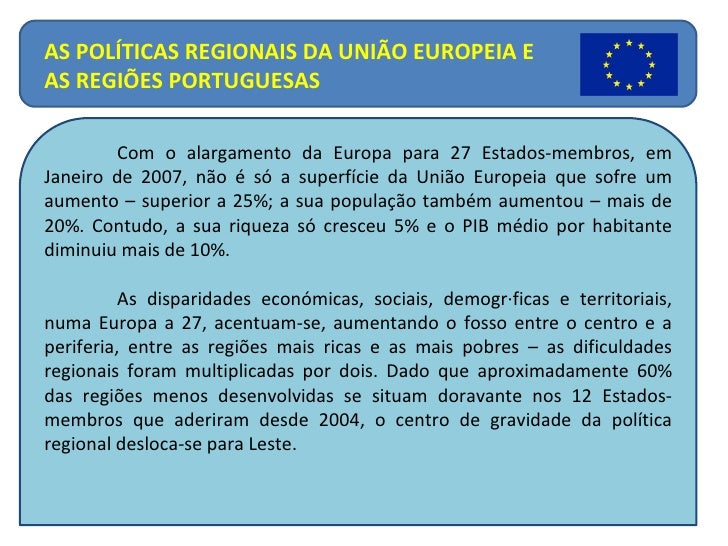 2. 2. Com o alargamento da Europa para 27 Estados-membros, em Janeiro de 2007, não é só a superfície da União Europeia que sofre um aumento – superior a 25%; a sua população também aumentou – mais de 20%. Contudo, a sua riqueza só cresceu 5% e o PIB médio por habitante diminuiu mais de 10%. As disparidades económicas, sociais, demográficas e territoriais, numa Europa a 27, acentuam-se, aumentando o fosso entre o centro e a periferia, entre as regiões mais ricas e as mais pobres – as dificuldades regionais foram multiplicadas por dois. Dado que aproximadamente 60% das regiões menos desenvolvidas se situam doravante nos 12 Estados-membros que aderiram desde 2004, o centro de gravidade da política regional desloca-se para Leste. AS POLÍTICAS REGIONAIS DA UNIÃO EUROPEIA E AS REGIÕES PORTUGUESAS