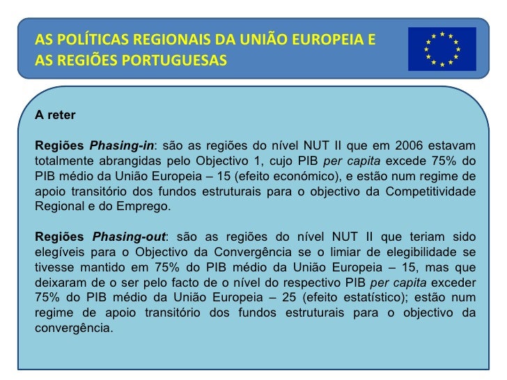 20. 21. A reter Regiões Phasing-in : são as regiões do nível NUT II que em 2006 estavam totalmente abrangidas pelo Objectivo 1, cujo PIB per capita excede 75% do PIB médio da União Europeia – 15 (efeito económico), e estão num regime de apoio transitório dos fundos estruturais para o objectivo da Competitividade Regional e do Emprego. Regiões Phasing-out : são as regiões do nível NUT II que teriam sido elegíveis para o Objectivo da Convergência se o limiar de elegibilidade se tivesse mantido em 75% do PIB médio da União Europeia – 15, mas que deixaram de o ser pelo facto de o nível do respectivo PIB per capita exceder 75% do PIB médio da União Europeia – 25 (efeito estatístico); estão num regime de apoio transitório dos fundos estruturais para o objectivo da convergência. AS POLÍTICAS REGIONAIS DA UNIÃO EUROPEIA E AS REGIÕES PORTUGUESAS