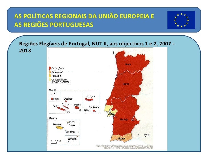 Regiões Elegíveis de Portugal, NUT II, aos objectivos 1 e 2, 2007 - 2013  AS POLÍTICAS REGIONAIS DA UNIÃO EUROPEIA E AS RE...
