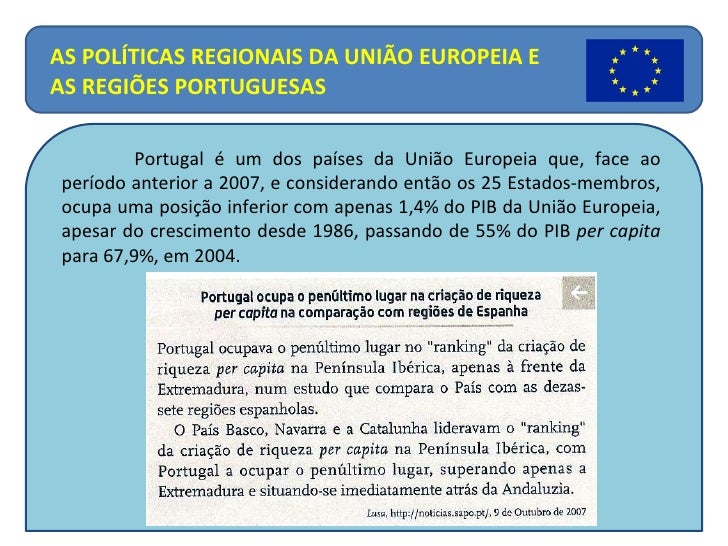 22. 23. Portugal é um dos países da União Europeia que, face ao período anterior a 2007, e considerando então os 25 Estados-membros, ocupa uma posição inferior com apenas 1,4% do PIB da União Europeia, apesar do crescimento desde 1986, passando de 55% do PIB per capita para 67,9%, em 2004. AS POLÍTICAS REGIONAIS DA UNIÃO EUROPEIA E AS REGIÕES PORTUGUESAS