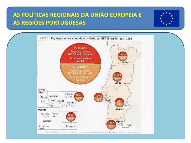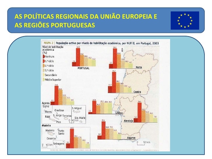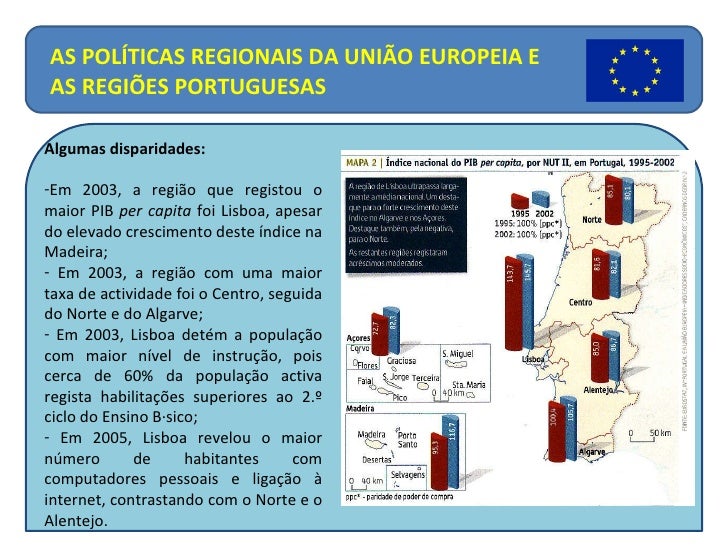 23. 24. <ul><li>Algumas disparidades: </li></ul><ul><li>Em 2003, a região que registou o maior PIB per capita foi Lisboa, apesar do elevado crescimento deste índice na Madeira; </li></ul><ul><li>Em 2003, a região com uma maior taxa de actividade foi o Centro, seguida do Norte e do Algarve; </li></ul><ul><li>Em 2003, Lisboa detém a população com maior nível de instrução, pois cerca de 60% da população activa regista habilitações superiores ao 2.º ciclo do Ensino Básico; </li></ul><ul><li>Em 2005, Lisboa revelou o maior número de habitantes com computadores pessoais e ligação à internet, contrastando com o Norte e o Alentejo. </li></ul>AS POLÍTICAS REGIONAIS DA UNIÃO EUROPEIA E AS REGIÕES PORTUGUESAS