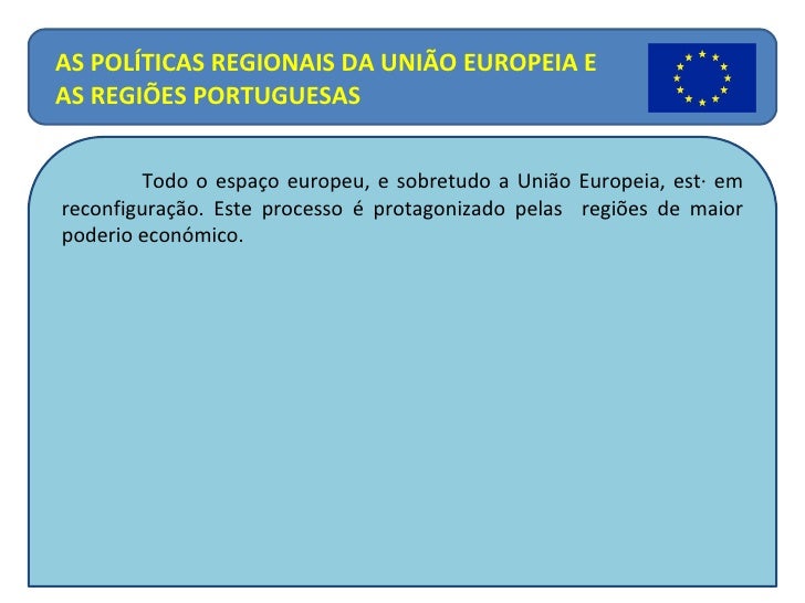 6. 6. Todo o espaço europeu, e sobretudo a União Europeia, está em reconfiguração. Este processo é protagonizado pelas regiões de maior poderio económico. AS POLÍTICAS REGIONAIS DA UNIÃO EUROPEIA E AS REGIÕES PORTUGUESAS