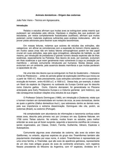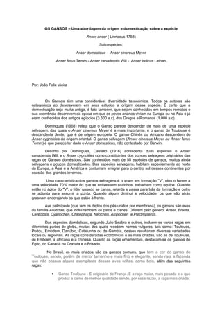 1. 1. OS GANSOS – Uma abordagem da origem e domesticação sobre a espécie Anser anser ( Linnaeus 1758) Sub-espécies: Anser domesticus - Anser cinereus Meyer Anser ferus Temm - Anser canadensis Will - Anser indicus Lathan.. Por: João Felix Vieira Os Gansos têm uma considerável diversidade taxonômica. Todos os autores são categóricos ao descreverem em seus estudos a origem dessa espécie. É certo que a domesticação seja muita antiga, é fato também, que sejam conhecidos em tempos remotos e sua ocorrência descrevem da época em que os povos arianos viviam na Europa ou na Ásia e já eram conhecidos dos antigos egípcios (3.500 a.c), dos Gregos e Romanos (1.000 a.c). Domingues (1968) relata que o Ganso parece descender de mais de uma espécie selvagem, das quais o Anser cinereus Meyer é a mais importante, e o ganso de Toulouse é descendente deste, que é de origem européia. O ganso Chinês ou Africano descendem do Anser cygnoides de origem oriental. O ganso selvagem (Anser cinereus Meyer ou Anser ferus Temm) é que parece ter dado o Anser domesticus, não contestado por Darwin. Descrito por Domingues, Castelló (1916) acrescenta duas espécies o Anser canadensis Will, e o Anser cygnoides como constituintes dos troncos selvagens originários das raças de Gansos domésticos. São conhecidos mais de 50 espécies de gansos, muitos ainda selvagens e poucos domesticados. Das espécies selvagens, habitam especialmente ao norte da Europa, a Ásia e a América e costumam emigrar para o centro sul desses continentes por ocasião dos grandes invernos. Uma característica dos gansos selvagens é o voam em formação "V", eles o fazem a uma velocidade 70% maior do que se estivessem sozinhos, trabalham como equipe. Quando estão no ápice do "V", o líder quando se cansa, retarda e passa para trás da formação e outro se adianta para assumir a ponta. Quando algum diminui a velocidade, os que vão atrás grasnam encorajando os que estão à frente. Ave palmípede (que tem os dedos dos pés unidos por membrana), os gansos são aves da família Anatidae, que inclui também os patos e cisnes. Diferem pelo gênero: Anser, Branta, Cereopsis, Cyanochen, Chloephaga, Neochen, Alopochen e Plectropterus. Das espécies domésticas, segundo Julio Seabra e outros, incluem-se varias raças em diferentes partes do globo, muitas dos quais recebem nomes vulgares, tais como: Toulouse, Poitou, Embdem, Danúbio, Catalunha ou de Gambia, desses resultaram diversas variedades locais ou regionais. As raças consideradas econômicas e as mais criadas, são as de Toulouse, de Embden, a africana e a chinesa. Quanto às raças ornamentais, destacam-se os gansos do Egito, do Canadá ou Gravata e o Frisado. No Brasil, os mais criados são os gansos comuns, que tem a cor do ganso de Toulouse, sendo, porém de menor tamanho e mais fino e elegante, sendo rara a fazenda que não possua alguns exemplares dessas aves soltas, como bois, além das seguintes raças: • Ganso Toulouse - É originário da França. É a raça maior, mais pesada e a que produz a carne de melhor qualidade sendo, por essa razão, a raça mais criada;