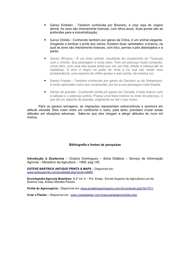 2. 2. • Ganso Embden - Também conhecida por Bremem, é uma raça de origem alemã. As aves são inteiramente brancas, com olhos azuis. Suas penas são as preferidas para a industrialização; • Ganso Chinês - Conhecido também por ganso da China, é um animal elegante, chegando a lembrar o porte dos cisnes. Existem duas variedades: a branca, na qual as aves são inteiramente brancas, com bico, pernas e pés alaranjados e a parda. • Ganso Africano - É um lindo animal, resultante do cruzamento do Toulouse com o Chinês. Sua plumagem é cinza claro. Tem um pescoço muito comprido, cinza claro, com uma raia quase preta que vai, por trás, desde a cabeça até as espáduas. O bico é negro na parte de cima e na sua raiz existe uma protuberância, uma espécie de chifre grosso e sem ponta, da mesma cor; • Ganso Frisado - Também conhecido por ganso do Danúbio ou de Sebastopol, é muito apreciado como ave ornamental, por ter a sua plumagem toda frisada. • Ganso de gravata - Conhecido ainda por ganso do Canadá, é todo branco com a cabeça e o pescoço pretos. Possui uma faixa branca no meio do pescoço, o que dá um aspecto de gravata, originando-se daí o seu nome. Para os gansos selvagens, as migrações representam sobrevivência e aventura em altitude elevada. Eles voam entre um continente e outro, para tanto, precisam cruzar essas altitudes em situações adversas. Sabe-se que eles chegam a atingir altitudes de nove mil metros. Bibliografia e fontes de pesquisas Introdução à Zootecnia – Octavio Domingues – Séria Didática – Serviço de Informação Agricola – Ministério da Agicultura – 1968, pag.145. ESTEVE BARTRICK ANTIQUE PRINTS & MAPS – Disponível em: www.antiqueprints.com/proddetail.php?prod=e9460 Enciclopédia Agrícola Brasileira: S-Z Vol. 6 - Por: Esalq - Escola Superior de Agricultura Luiz de Queiroz Usp, Aristeu Mendes Peixoto Portal do Agronegócio - Disponível em: www.portaldoagronegocio.com.br/conteudo.php?id=7511 Criar e Plantar – Disponível em: www.criareplantar.com.br/pecuaria/ganso/index.php