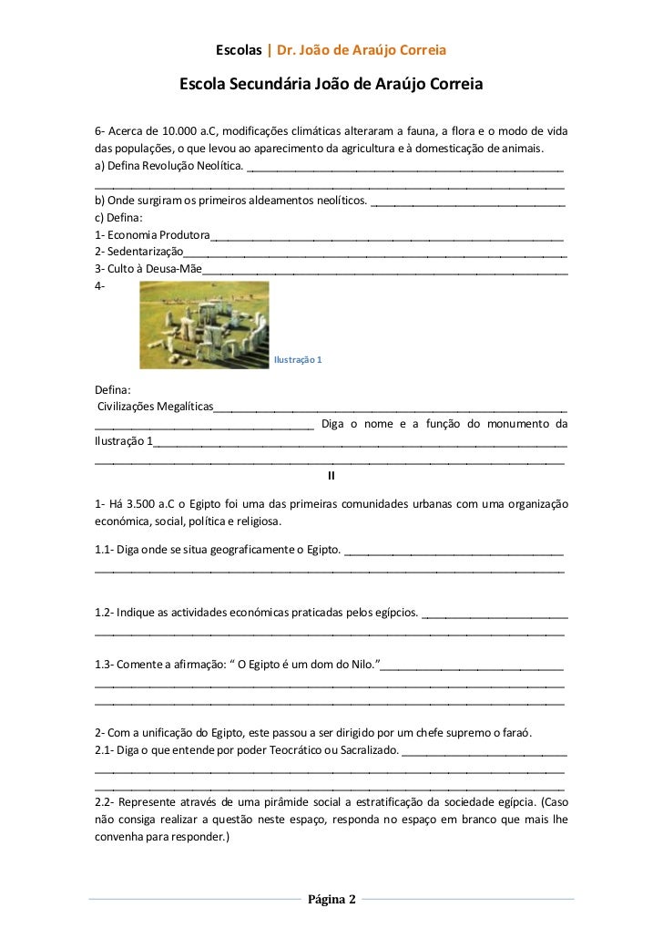 2. 2. Escolas | Dr. João de Araújo Correia Escola Secundária João de Araújo Correia6- Acerca de 10.000 a.C, modificações climáticas alteraram a fauna, a flora e o modo de vidadas populações, o que levou ao aparecimento da agricultura e à domesticação de animais.a) Defina Revolução Neolítica. _________________________________________________________________________________________________________________________________b) Onde surgiram os primeiros aldeamentos neolíticos. ________________________________c) Defina:1- Economia Produtora__________________________________________________________2- Sedentarização_______________________________________________________________3- Culto à Deusa-Mãe____________________________________________________________4- Ilustração 1Defina: Civilizações Megalíticas______________________________________________________________________________________________ Diga o nome e a função do monumento daIlustração 1_________________________________________________________________________________________________________________________________________________ II1- Há 3.500 a.C o Egipto foi uma das primeiras comunidades urbanas com uma organizaçãoeconómica, social, política e religiosa.1.1- Diga onde se situa geograficamente o Egipto. _________________________________________________________________________________________________________________1.2- Indique as actividades económicas praticadas pelos egípcios. _____________________________________________________________________________________________________1.3- Comente a afirmação: “ O Egipto é um dom do Nilo.”________________________________________________________________________________________________________________________________________________________________________________________2- Com a unificação do Egipto, este passou a ser dirigido por um chefe supremo o faraó.2.1- Diga o que entende por poder Teocrático ou Sacralizado. _____________________________________________________________________________________________________________________________________________________________________________________2.2- Represente através de uma pirâmide social a estratificação da sociedade egípcia. (Casonão consiga realizar a questão neste espaço, responda no espaço em branco que mais lheconvenha para responder.) Página 2