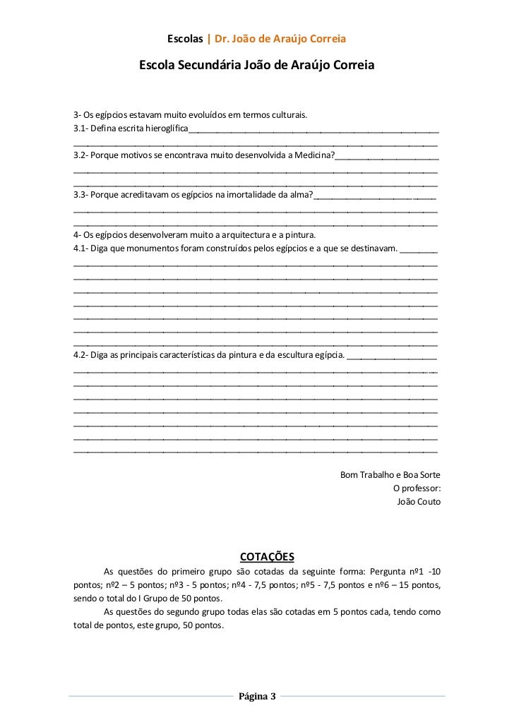 3. 3. Escolas | Dr. João de Araújo Correia Escola Secundária João de Araújo Correia3- Os egípcios estavam muito evoluídos em termos culturais.3.1- Defina escrita hieroglífica__________________________________________________________________________________________________________________________________3.2- Porque motivos se encontrava muito desenvolvida a Medicina?________________________________________________________________________________________________________________________________________________________________________________3.3- Porque acreditavam os egípcios na imortalidade da alma?____________________________________________________________________________________________________________________________________________________________________________________4- Os egípcios desenvolveram muito a arquitectura e a pintura.4.1- Diga que monumentos foram construídos pelos egípcios e a que se destinavam. ___________________________________________________________________________________________________________________________________________________________________________________________________________________________________________________________________________________________________________________________________________________________________________________________________________________________________________________________________________________________________________________________________________________________________4.2- Diga as principais características da pintura e da escultura egípcia. ______________________________________________________________________________________________________________________________________________________________________________________________________________________________________________________________________________________________________________________________________________________________________________________________________________________________________________________________________________________________________________________________________________________________________________ Bom Trabalho e Boa Sorte O professor: João Couto COTAÇÕES As questões do primeiro grupo são cotadas da seguinte forma: Pergunta nº1 -10pontos; nº2 – 5 pontos; nº3 - 5 pontos; nº4 - 7,5 pontos; nº5 - 7,5 pontos e nº6 – 15 pontos,sendo o total do I Grupo de 50 pontos. As questões do segundo grupo todas elas são cotadas em 5 pontos cada, tendo comototal de pontos, este grupo, 50 pontos. Página 3