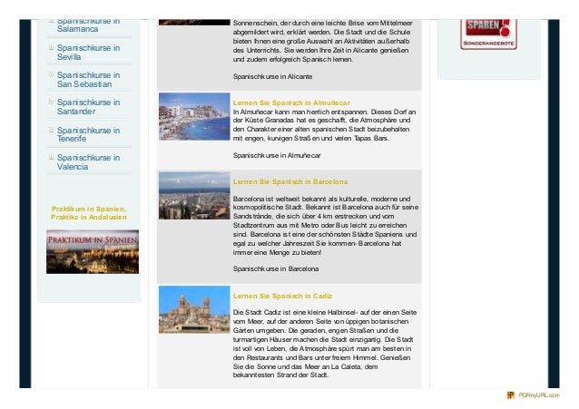 2. 2. Sonnenschein, der durch eine leichte Brise vom Mittelmeer abgemildert wird, erklärt werden. Die Stadt und die Schule bieten Ihnen eine große Auswahl an Aktivitäten außerhalb des Unterrichts. Sie werden Ihre Zeit in Alicante genießen und zudem erfolgreich Spanisch lernen. Spanischkurse in Alicante Lernen Sie Spanisch in Almuñecar In Almuñecar kann man herrlich entspannen. Dieses Dorf an der Küste Granadas hat es geschafft, die Atmosphäre und den Charakter einer alten spanischen Stadt beizubehalten mit engen, kurvigen Straßen und vielen Tapas Bars. Spanischkurse in Almuñecar Lernen Sie Spanisch in Barcelona Barcelona ist weltweit bekannt als kulturelle, moderne und kosmopolitische Stadt. Bekannt ist Barcelona auch für seine Sandstrände, die sich über 4 km erstrecken und vom Stadtzentrum aus mit Metro oder Bus leicht zu erreichen sind. Barcelona ist eine der schönsten Städte Spaniens und egal zu welcher Jahreszeit Sie kommen- Barcelona hat immer eine Menge zu bieten! Spanischkurse in Barcelona Lernen Sie Spanisch in Cadiz Die Stadt Cadiz ist eine kleine Halbinsel- auf der einen Seite vom Meer, auf der anderen Seite von üppigen botanischen Gärten umgeben. Die geraden, engen Straßen und die turmartigen Häuser machen die Stadt einzigartig. Die Stadt ist voll von Leben, die Atmosphäre spürt man am besten in den Restaurants und Bars unter freiem Himmel. Genießen Sie die Sonne und das Meer an La Caleta, dem bekanntesten Strand der Stadt. Spanischkurse in Salamanca Spanischkurse in Sevilla Spanischkurse in San Sebastian Spanischkurse in Santander Spanischkurse in Tenerife Spanischkurse in Valencia Praktikum in Spanien, Praktika in Andalusien PDFmyURL.com