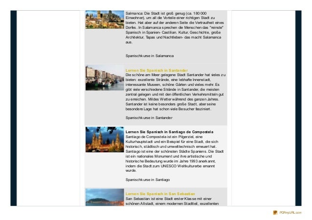 4. 4. Salmanca: Die Stadt ist groß genug (ca. 180 000 Einwohner), um all die Vorteile einer richtigen Stadt zu bieten. Hat aber auf der anderen Seite die Vertrautheit eines Dorfes. In Salamanca sprechen die Menschen das "reinste" Spanisch in Spanien- Castilian. Kultur, Geschichte, große Architektur, Tapas und Nachtleben- das macht Salamanca aus. Spanischkurse in Salamanca Lernen Sie Spanisch in Santander Die schöne am Meer gelegene Stadt Santander hat vieles zu bieten: exzellente Strände, eine lebhafte Innenstadt, interessante Museen, schöne Gärten und vieles mehr. Es gibt viele verschiedene Strände in Santander, die meisten zentral gelegen und mit den öffentlichen Verkehrsmitteln gut zu erreichen. Mildes Wetter während des ganzen Jahres. Santander ist keine besonders große Stadt, aber seine besondere Lage hat schon viele Besucher fasziniert. Spanischkurse in Santander Lernen Sie Spanisch in Santiago de Compostela Santiago de Compostela ist ein Pilgerziel, eine Kulturhauptstadt und ein Beispiel für eine Stadt, die sich historisch, städtisch und umwelttechnisch erneuert hat. Santiago ist eine der schönsten Städte Spaniens. Die Stadt ist ein nationales Monument und ihre artistische und historische Bedeutung wurde im Jahre 1993 anerkannt, indem die Stadt zum UNESCO Weltkulturerbe ernannt wurde. Spanischkurse in Santiago Lernen Sie Spanisch in San Sebastian San Sebastian ist eine Stadt erster Klasse mit einer schönen Altstadt, einem modernen Stadtteil, exzellenten PDFmyURL.com