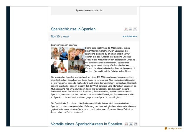 6. 6. Spanischkurse in Valencia administratorNov 30 | 00:04 Spanischkurse in Spanien Spanischkurse in Spanien Spanorama gibt Ihnen die Möglichkeit, in den bekanntesten Sprachschulen Spaniens die spanische Sprache zu erlernen. Direkt vor Ort können Sie das Studium der Sprache und das Studium der Kultur durch den alltäglichen Umgang mit Einheimischen kombinieren. Spanorama Languages bietet eine große Bandbreite von Kursen, die allen individuellen Ansprüchen gerecht werden. Sie sind ideal für Schüler jeden Alters. Die spanische Sprache wird weltweit von über 400 Millionen Menschen gesprochen - eigentlich schon Grund genug, diese Sprache zu erlernen! Aber noch überwältigender ist die Tatsache, dass die Hälfte der Bevölkerung der westlichen Hemisphäre Spanisch spricht! Das heißt, dass in diesem Teil der Welt genauso viele Menschen Spanisch als Muttersprache haben wie Englisch. Nicht nur in Spanien, sondern auch in ganz Südamerika (mit Ausnahme von Brasilien), Zentralamerika, Karibik und Mexiko ist Spanisch die Amtssprache. Und auch innerhalb der Vereinigten Staaten von Amerika ist Spanisch die am zweit meisten gesprochene Sprache nach Englisch. Die Qualität der Schule und die Professionalität der Lehrer wird Ihren Aufenthalt in Spanien zu einer unvergesslichen Erfahrung machen. Wir glauben, dass nichts besser geplant sein muss als eine Sprach- und Kulturreise nach Spanien. Unser Ziel ist es, Ihnen dabei zur Seite zu stehen! Vorteile eines Spanischkurses in Spanien PDFmyURL.com