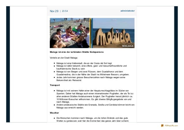7. 7. administratorNov 29 | 23:54 Malaga ist eine der schönsten Städte Südspaniens Vorteile an der Stadt Malaga Malaga ist eine Hafenstadt, die an der Costa del Sol liegt Malaga ist dafür bekannt, eine offene, gast- und besucherfreundliche und kaufmännische Stadt zu sein Malaga ist von Bergen und zwei Flüssen, dem Guadalhorce und dem Guadalmedina, die in der Nähe der Stadt ins Mittelmeer fliessen, umgeben. Jedes Jahr kommen grosse Besucherzahlen nach Malaga wegen seine Bekanntheit als Reiseziel. Transport Malaga ist mit seinem Hafen einer der Hauptumschlagplätze im Süden von Spanien. Daher hat Malaga auch einen internationalen Flughafen, der als Tor zu allen anderen Städten Andalusionens fungiert. Der Flughafen heisst jährlich ca. 10 Millionen Besucher willkommen. Es gibt diverse Billigflugangebote von und nach Malaga. Andere andalusische Städte wie Granada, Sevilla und Cordoba können leicht von Malaga aus erreicht werden. Weather Die Menschen kommen nach Malaga, um die tollen Strände und das gute Wetter zu geniessen, weil hier die Sonne fast das ganze Jahr über scheint. PDFmyURL.com