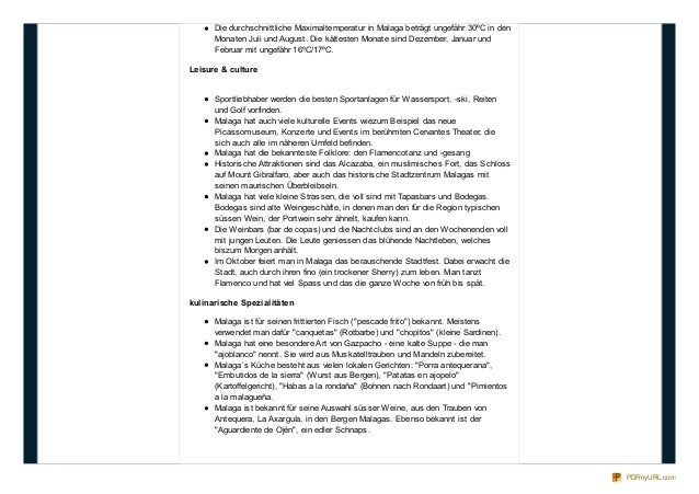 8. 8. Die durchschnittliche Maximaltemperatur in Malaga beträgt ungefähr 30ºC in den Monaten Juli und August. Die kältesten Monate sind Dezember, Januar und Februar mit ungefähr 16ºC/17ºC. Leisure & culture Sportliebhaber werden die besten Sportanlagen für Wassersport, -ski, Reiten und Golf vorfinden. Malaga hat auch viele kulturelle Events wiezum Beispiel das neue Picassomuseum, Konzerte und Events im berühmten Cervantes Theater, die sich auch alle im näheren Umfeld befinden. Malaga hat die bekannteste Folklore: den Flamencotanz und -gesang Historische Attraktionen sind das Alcazaba, ein muslimisches Fort, das Schloss auf Mount Gibralfaro, aber auch das historische Stadtzentrum Malagas mit seinen maurischen Überbleibseln. Malaga hat viele kleine Strassen, die voll sind mit Tapasbars und Bodegas. Bodegas sind alte Weingeschäfte, in denen man den für die Region typischen süssen Wein, der Portwein sehr ähnelt, kaufen kann. Die Weinbars (bar de copas) und die Nachtclubs sind an den Wochenenden voll mit jungen Leuten. Die Leute geniessen das blühende Nachtleben, welches biszum Morgen anhält. Im Oktober feiert man in Malaga das berauschende Stadtfest. Dabei erwacht die Stadt, auch durch ihren fino (ein trockener Sherry) zum leben. Man tanzt Flamenco und hat viel Spass und das die ganze Woche von früh bis spät. kulinarische Spezialitäten Malaga ist für seinen frittierten Fisch ("pescade frito") bekannt. Meistens verwendet man dafür "canquetas" (Rotbarbe) und "chopitos" (kleine Sardinen). Malaga hat eine besondere Art von Gazpacho - eine kalte Suppe - die man "ajoblanco" nennt. Sie wird aus Muskatelltrauben und Mandeln zubereitet. Malaga´s Küche besteht aus vielen lokalen Gerichten: "Porra antequerana", "Embutidos de la sierra" (Wurst aus Bergen), "Patatas en ajopelo" (Kartoffelgericht), "Habas a la rondaña" (Bohnen nach Rondaart) und "Pimientos a la malagueña. Malaga ist bekannt für seine Auswahl süsser Weine, aus den Trauben von Antequera, La Axarguía, in den Bergen Malagas. Ebenso bekannt ist der "Aguardiente de Ojén", ein edler Schnaps. PDFmyURL.com