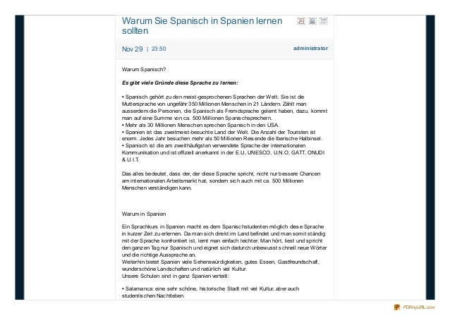 9. 9. administratorNov 29 | 23:50 Warum Sie Spanisch in Spanien lernen sollten Warum Spanisch? Es gibt viele Gründe diese Sprache zu lernen: • Spanisch gehört zu den meist-gesprochenen Sprachen der Welt. Sie ist die Muttersprache von ungefähr 350 Millionen Menschen in 21 Ländern. Zählt man ausserdem die Personen, die Spanisch als Fremdsprache gelernt haben, dazu, kommt man auf eine Summe von ca. 500 Millionen Spanischsprechern. • Mehr als 30 Millionen Menschen sprechen Spanisch in den USA. • Spanien ist das zweitmeist-besuchte Land der Welt. Die Anzahl der Touristen ist enorm. Jedes Jahr besuchen mehr als 50 Millionen Reisende die Iberische Halbinsel. • Spanisch ist die am zweithäufigsten verwendete Sprache der internationalen Kommunikation und ist offiziell anerkannt in der E.U, UNESCO, U.N.O, GATT, ONUDI & U.I.T. Das alles bedeutet, dass der, der diese Sprache spricht, nicht nur bessere Chancen am internationalen Arbeitsmarkt hat, sondern sich auch mit ca. 500 Millionen Menschen verständigen kann. Warum in Spanien Ein Sprachkurs in Spanien macht es dem Spanischstudenten möglich diese Sprache in kurzer Zeit zu erlernen. Da man sich direkt im Land befindet und man somit ständig mit der Sprache konfrontiert ist, lernt man einfach leichter. Man hört, liest und spricht den ganzen Tag nur Spanisch und eignet sich dadurch unbewusst schnell neue Wörter und die richtige Aussprache an. Weiterhin bietet Spanien viele Sehenswürdigkeiten, gutes Essen, Gastfreundschaft, wunderschöne Landschaften und natürlich viel Kultur. Unsere Schulen sind in ganz Spanien verteilt: • Salamanca: eine sehr schöne, historische Stadt mit viel Kultur, aber auch studentischen Nachtleben PDFmyURL.com