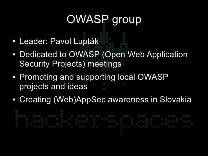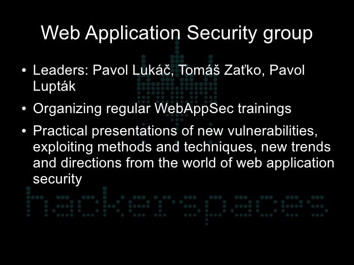 16. 16. Web Application Security group ● Leaders: Pavol Lukáč, Tomáš Zaťko, Pavol Lupták ● Organizing regular WebAppSec trainings ● Practical presentations of new vulnerabilities, exploiting methods and techniques, new trends and directions from the world of web application security