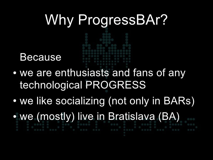 2. 2. Why ProgressBAr? Because ● we are enthusiasts and fans of any technological PROGRESS ● we like socializing (not only in BARs) ● we (mostly) live in Bratislava (BA)