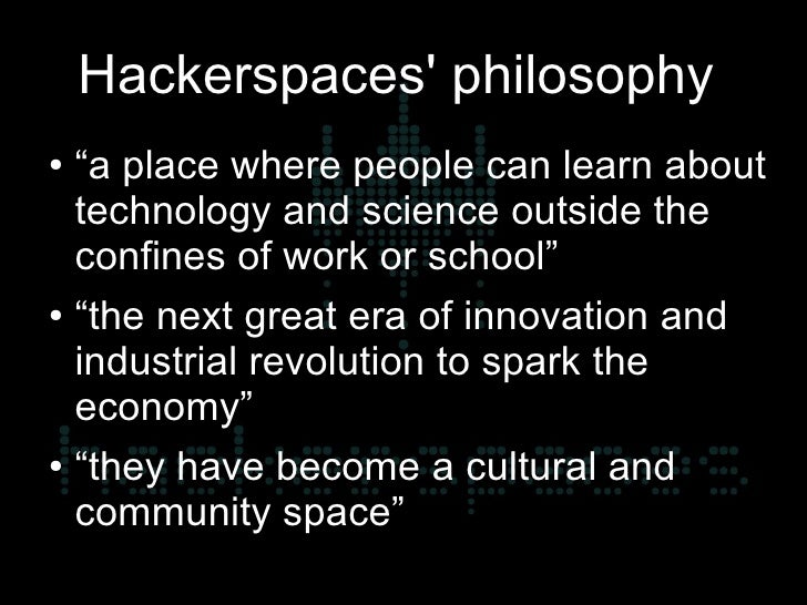 3. 3. Hackerspaces' philosophy ● “a place where people can learn about technology and science outside the confines of work or school” ● “the next great era of innovation and industrial revolution to spark the economy” ● “they have become a cultural and community space”