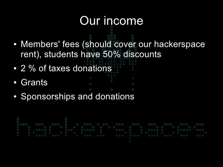 7. 7. Our income ● Members' fees (should cover our hackerspace rent), students have 50% discounts ● 2 % of taxes donations ● Grants ● Sponsorships and donations