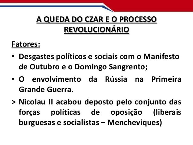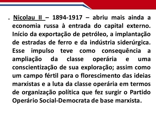 5. 5. . Nicolau II – 1894-1917 – abriu mais ainda a economia russa à entrada do capital externo. Início da exportação de petróleo, a implantação de estradas de ferro e da indústria siderúrgica. Esse impulso teve como consequência a ampliação da classe operária e uma conscientização de sua exploração; assim como um campo fértil para o florescimento das ideias marxistas e a luta da classe operária em termos de organização política que fez surgir o Partido Operário Social-Democrata de base marxista.