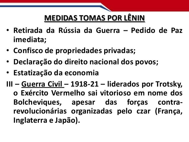 10. 10. MEDIDAS TOMAS POR LÊNIN • Retirada da Rússia da Guerra – Pedido de Paz imediata; • Confisco de propriedades privadas; • Declaração do direito nacional dos povos; • Estatização da economia III – Guerra Civil – 1918-21 – liderados por Trotsky, o Exército Vermelho sai vitorioso em nome dos Bolcheviques, apesar das forças contrarevolucionárias organizadas pelo czar (França, Inglaterra e Japão).
