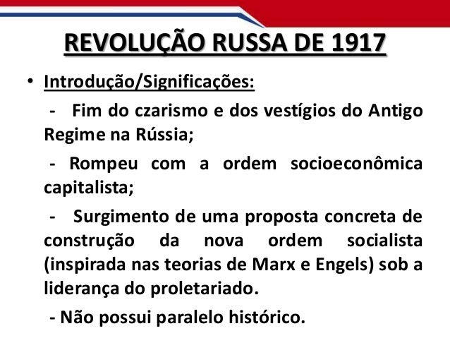 1. 1. REVOLUÇÃO RUSSA DE 1917 • Introdução/Significações: - Fim do czarismo e dos vestígios do Antigo Regime na Rússia; - Rompeu com a ordem socioeconômica capitalista; - Surgimento de uma proposta concreta de construção da nova ordem socialista (inspirada nas teorias de Marx e Engels) sob a liderança do proletariado. - Não possui paralelo histórico.