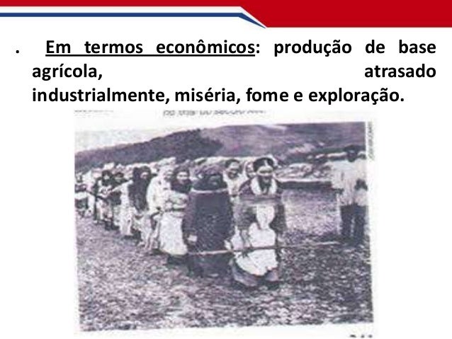 3. 3. . Em termos econômicos: produção de base agrícola, atrasado industrialmente, miséria, fome e exploração.