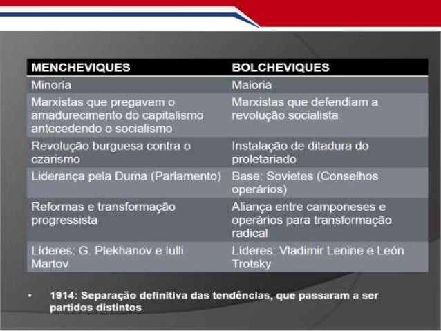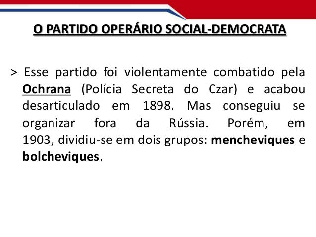 6. 6. O PARTIDO OPERÁRIO SOCIAL-DEMOCRATA > Esse partido foi violentamente combatido pela Ochrana (Polícia Secreta do Czar) e acabou desarticulado em 1898. Mas conseguiu se organizar fora da Rússia. Porém, em 1903, dividiu-se em dois grupos: mencheviques e bolcheviques.