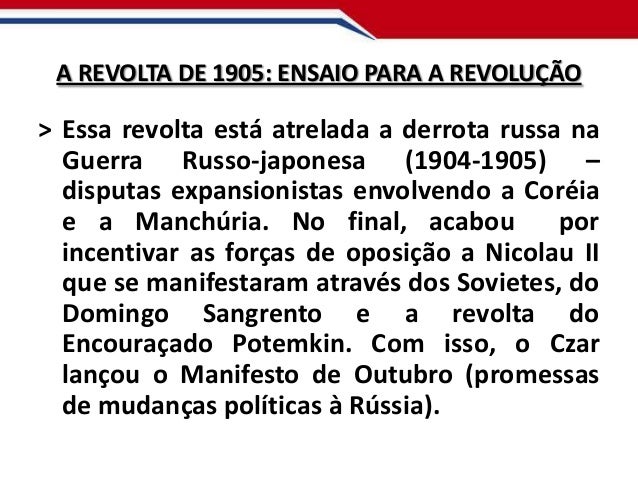 7. 7. A REVOLTA DE 1905: ENSAIO PARA A REVOLUÇÃO > Essa revolta está atrelada a derrota russa na Guerra Russo-japonesa (1904-1905) – disputas expansionistas envolvendo a Coréia e a Manchúria. No final, acabou por incentivar as forças de oposição a Nicolau II que se manifestaram através dos Sovietes, do Domingo Sangrento e a revolta do Encouraçado Potemkin. Com isso, o Czar lançou o Manifesto de Outubro (promessas de mudanças políticas à Rússia).