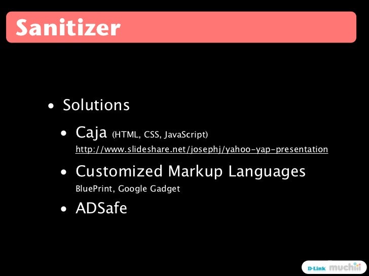 16. 16. Sanitizer • Solutions • Caja (HTML, CSS, JavaScript) http://www.slideshare.net/josephj/yahoo-yap-presentation • Customized Markup Languages BluePrint, Google Gadget • ADSafe