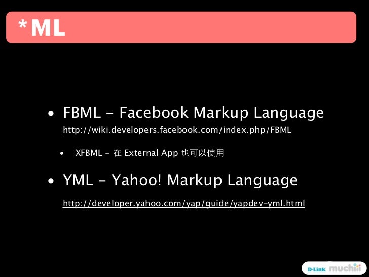 18. 18. *ML • FBML - Facebook Markup Language http://wiki.developers.facebook.com/index.php/FBML • XFBML - External App • YML - Yahoo! Markup Language http://developer.yahoo.com/yap/guide/yapdev-yml.html