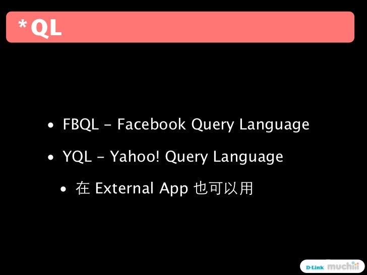 22. 22. *QL • FBQL - Facebook Query Language • YQL - Yahoo! Query Language • External App