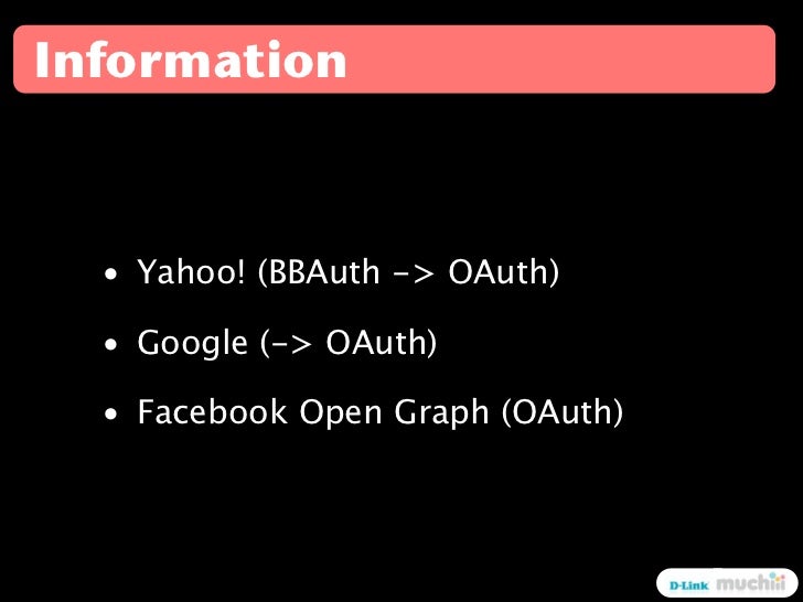 7. 7. Information • Yahoo! (BBAuth -> OAuth) • Google (-> OAuth) • Facebook Open Graph (OAuth)