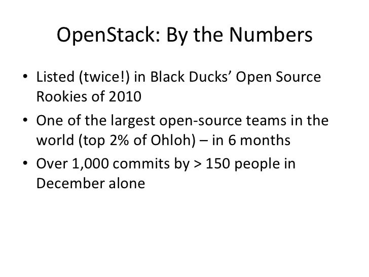 11. 11. OpenStack: By the Numbers<br />Listed (twice!) in Black Ducks’ Open Source Rookies of 2010<br />One of the largest open-source teams in the world (top 2% of Ohloh) – in 6 months<br />Over 1,000 commits by > 150 people in December alone<br />