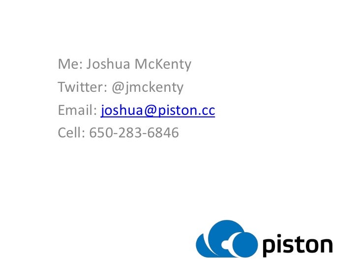 23. 23. Me: Joshua McKenty<br />Twitter: @jmckenty<br />Email: joshua@piston.cc<br />Cell: 650-283-6846<br />