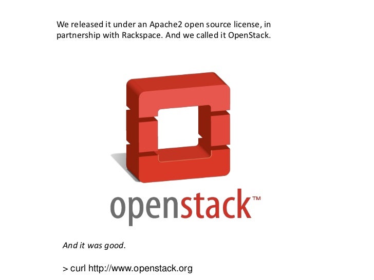 8. 8. We released it under an Apache2 open source license, in partnership with Rackspace. And we called it OpenStack.<br />And it was good.<br />> curl http://www.openstack.org<br />
