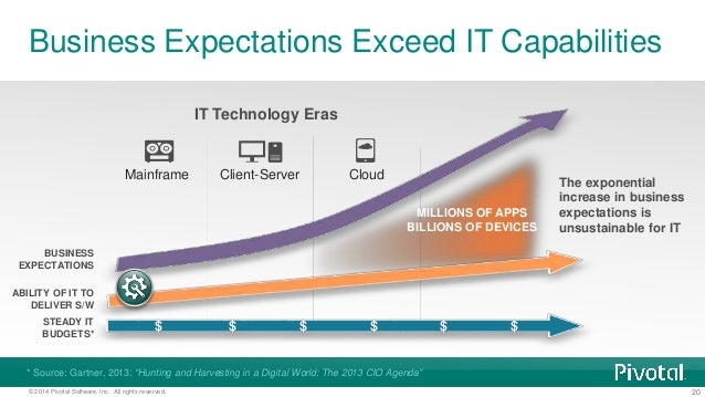 20. 20. 20© 2014 Pivotal Software, Inc. All rights reserved. Business Expectations Exceed IT Capabilities Cloud IT Technology Eras Mainframe Client-Server The exponential increase in business expectations is unsustainable for IT MILLIONS OF APPS BILLIONS OF DEVICES * Source: Gartner, 2013: “Hunting and Harvesting in a Digital World: The 2013 CIO Agenda” $ $ $ $ $ $ ABILITY OF IT TO DELIVER S/W STEADY IT BUDGETS* BUSINESS EXPECTATIONS
