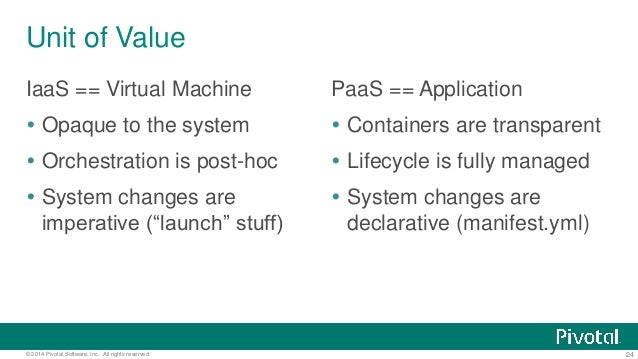 24. 24. 24© 2014 Pivotal Software, Inc. All rights reserved. Unit of Value IaaS == Virtual Machine  Opaque to the system  Orchestration is post-hoc  System changes are imperative (“launch” stuff) PaaS == Application  Containers are transparent  Lifecycle is fully managed  System changes are declarative (manifest.yml)