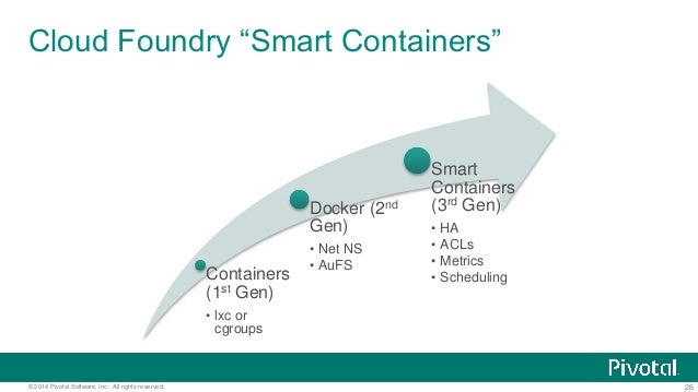 26. 26. 26© 2014 Pivotal Software, Inc. All rights reserved. Cloud Foundry “Smart Containers” Containers (1st Gen) • lxc or cgroups Docker (2nd Gen) • Net NS • AuFS Smart Containers (3rd Gen) • HA • ACLs • Metrics • Scheduling