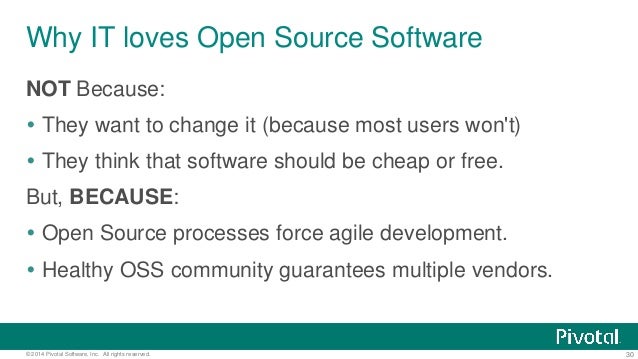 30. 30. 30© 2014 Pivotal Software, Inc. All rights reserved. Why IT loves Open Source Software NOT Because:  They want to change it (because most users won't)  They think that software should be cheap or free. But, BECAUSE:  Open Source processes force agile development.  Healthy OSS community guarantees multiple vendors.