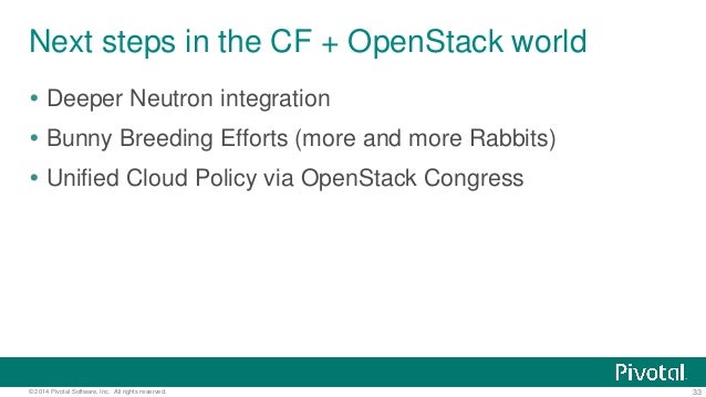 33. 33. 33© 2014 Pivotal Software, Inc. All rights reserved. Next steps in the CF + OpenStack world  Deeper Neutron integration  Bunny Breeding Efforts (more and more Rabbits)  Unified Cloud Policy via OpenStack Congress