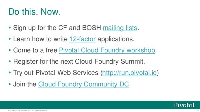 34. 34. 34© 2014 Pivotal Software, Inc. All rights reserved. Do this. Now.  Sign up for the CF and BOSH mailing lists.  Learn how to write 12-factor applications.  Come to a free Pivotal Cloud Foundry workshop.  Register for the next Cloud Foundry Summit.  Try out Pivotal Web Services (http://run.pivotal.io)  Join the Cloud Foundry Community DC.
