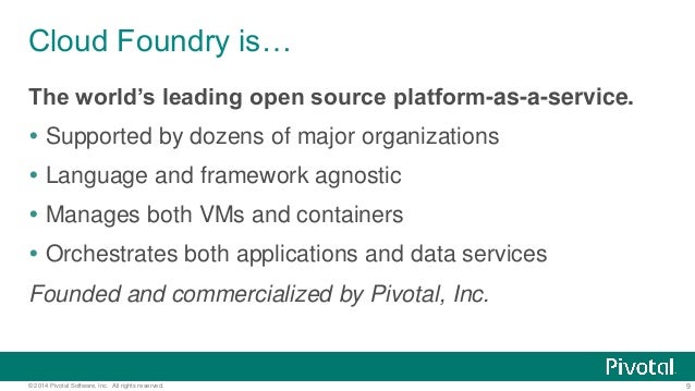 9. 9. 9© 2014 Pivotal Software, Inc. All rights reserved. Cloud Foundry is… The world’s leading open source platform-as-a-service.  Supported by dozens of major organizations  Language and framework agnostic  Manages both VMs and containers  Orchestrates both applications and data services Founded and commercialized by Pivotal, Inc.
