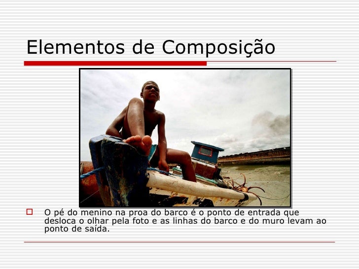 11. 11. Elementos de Composição <ul><li>O pé do menino na proa do barco é o ponto de entrada que desloca o olhar pela foto e as linhas do barco e do muro levam ao ponto de saída. </li></ul>