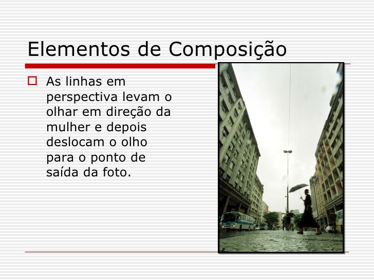 12. 12. Elementos de Composição <ul><li>As linhas em perspectiva levam o olhar em direção da mulher e depois deslocam o olho para o ponto de saída da foto. </li></ul>