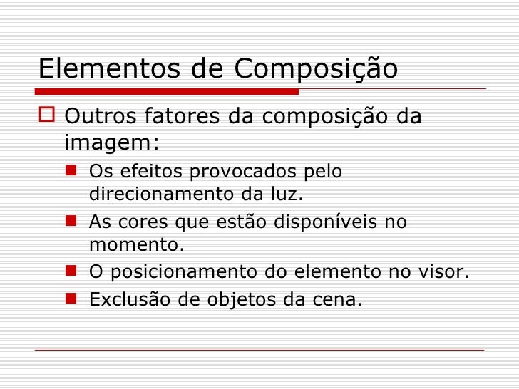 14. 14. Elementos de Composição <ul><li>Outros fatores da composição da imagem: </li></ul><ul><ul><li>Os efeitos provocados pelo direcionamento da luz. </li></ul></ul><ul><ul><li>As cores que estão disponíveis no momento. </li></ul></ul><ul><ul><li>O posicionamento do elemento no visor. </li></ul></ul><ul><ul><li>Exclusão de objetos da cena. </li></ul></ul>